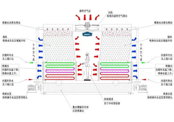 工作流体(纯水或其它液体)在闭式冷却塔的盘管中循环,工作流体的热量经过盘管散入流过盘管的水中。同时机组外的空气从双侧面上的进风格栅进入,与水的流动方向垂直,横向流经盘管一小部分水蒸发而吸走热量,热湿空气由冷却塔顶部的排风机排到大气中。其余的水则落入底部水槽中,由水泵再循环至水分布系统经过预冷填料又淋回到盘管上。
